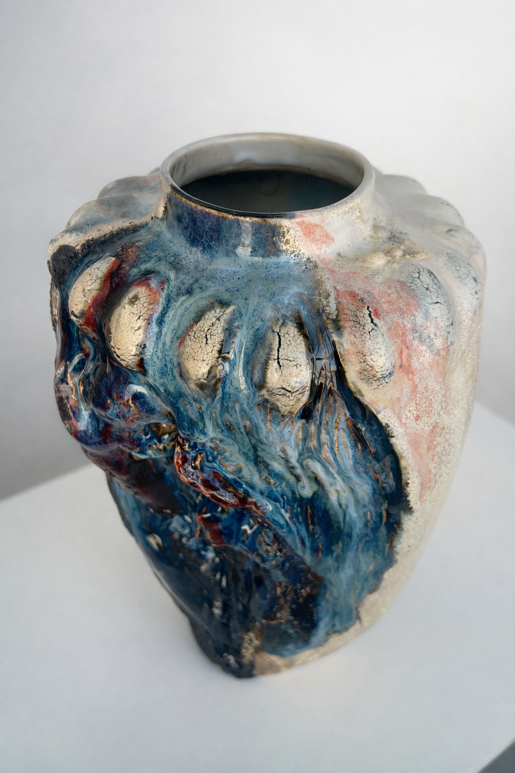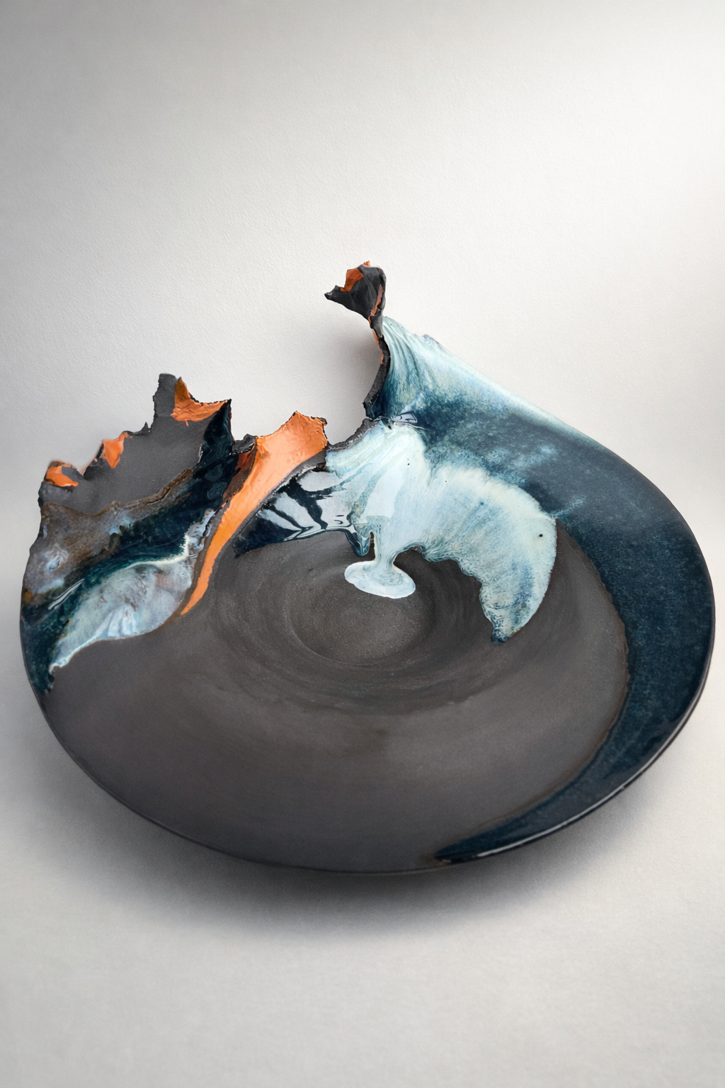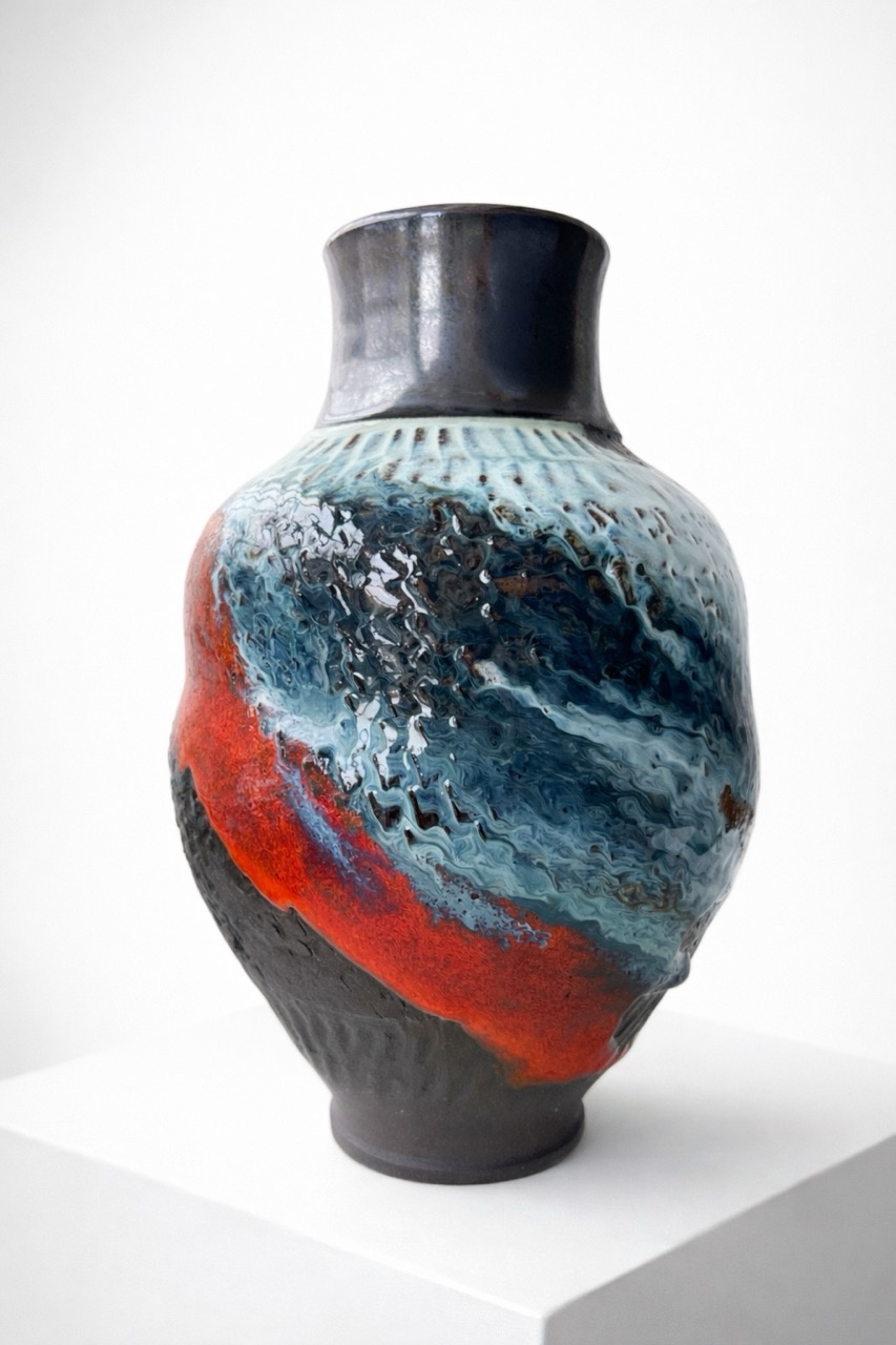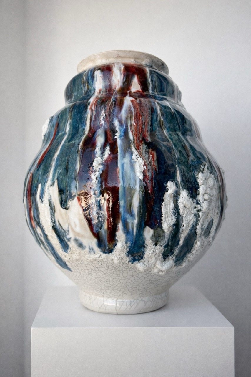Процесс начинается с «идеальной» формы на круге, которую я намеренно нарушаю. Встраиваю в тело сосуда новые, диссонирующие элементы и перегружаю глазурь, позволяя материалу вступить в игру со случайностью, обнажить скрытые слои и текстуры.