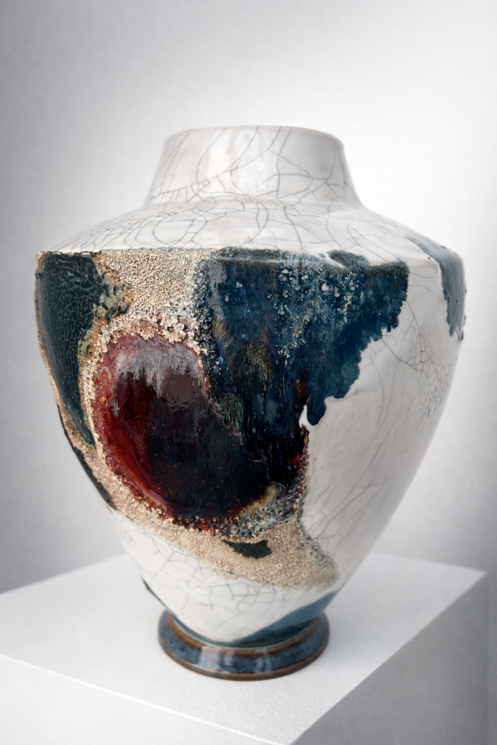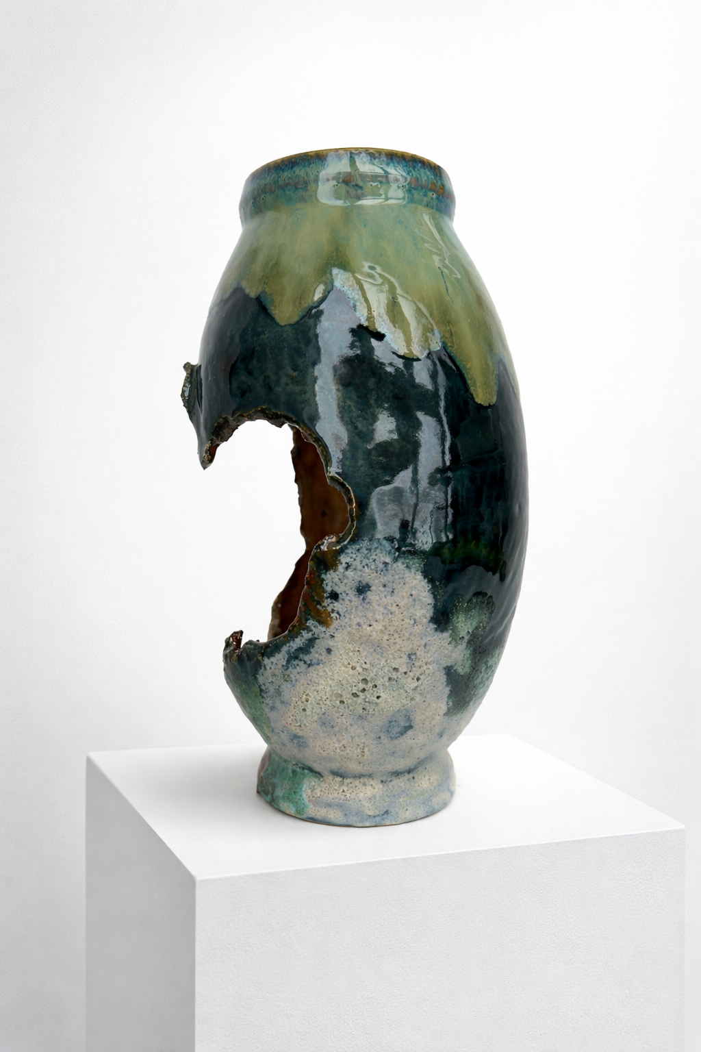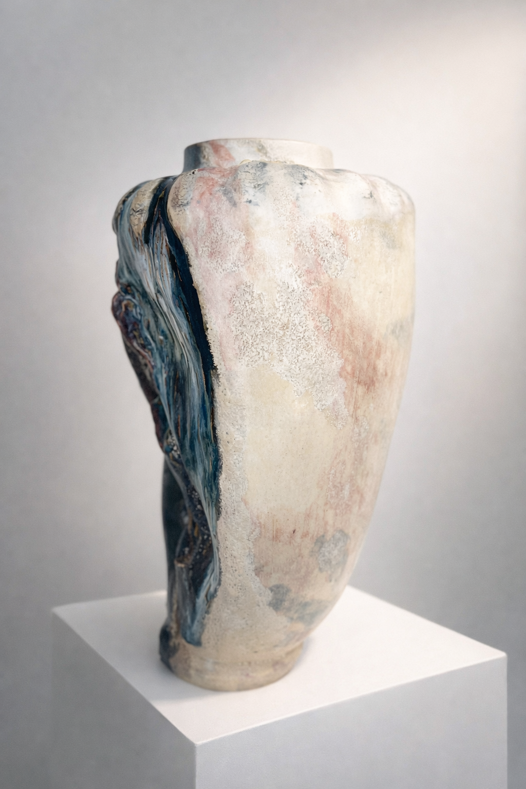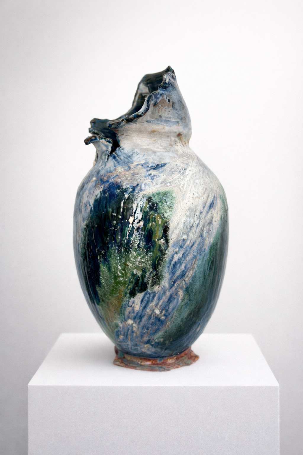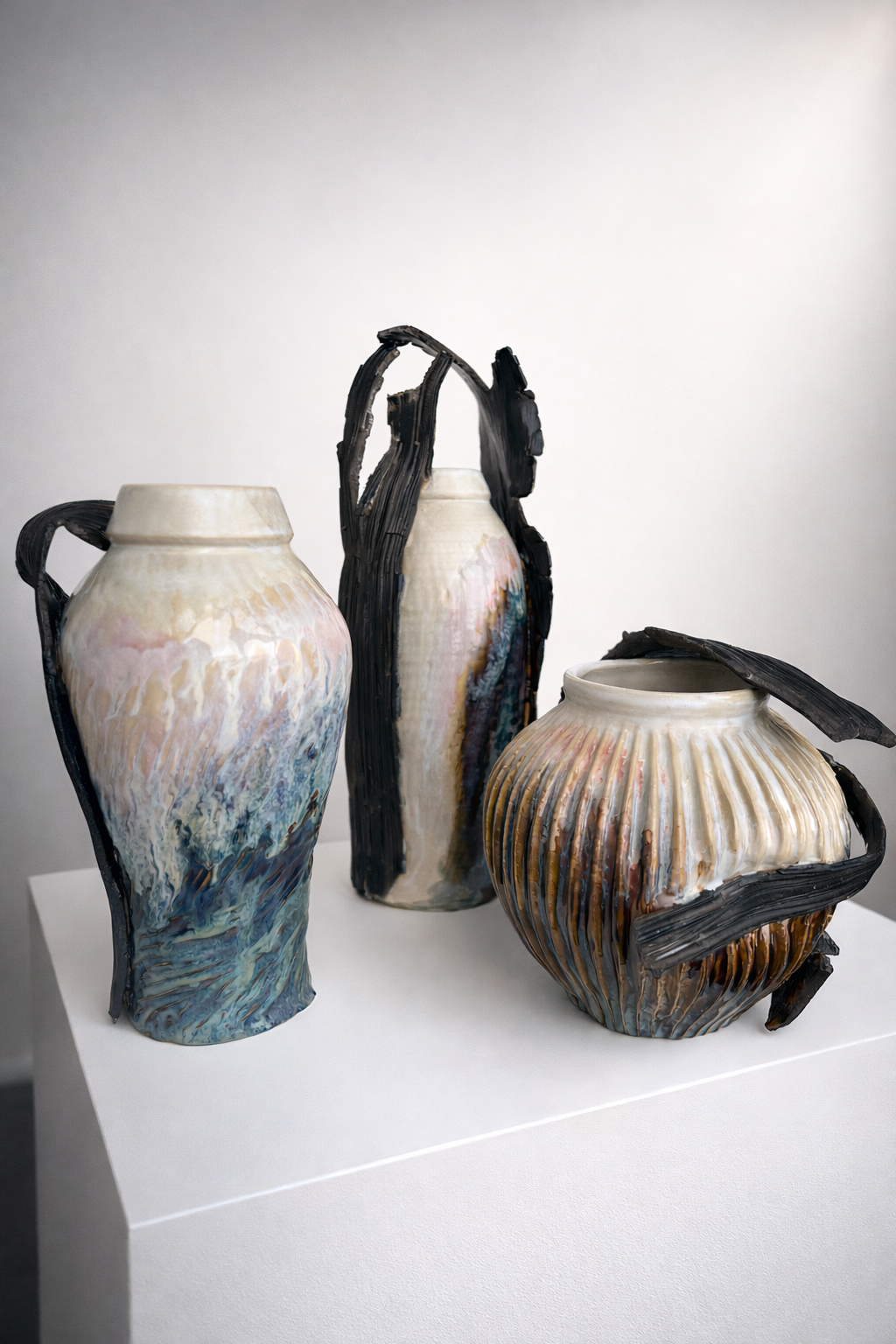 Процесс начинается с «идеальной» формы на круге, которую я намеренно нарушаю. Встраиваю в тело сосуда новые, диссонирующие элементы и перегружаю глазурь, позволяя материалу вступить в игру со случайностью, обнажить скрытые слои и текстуры.