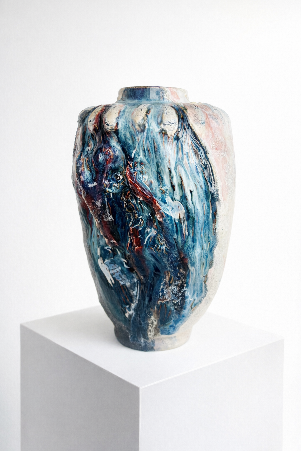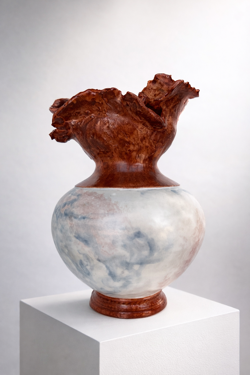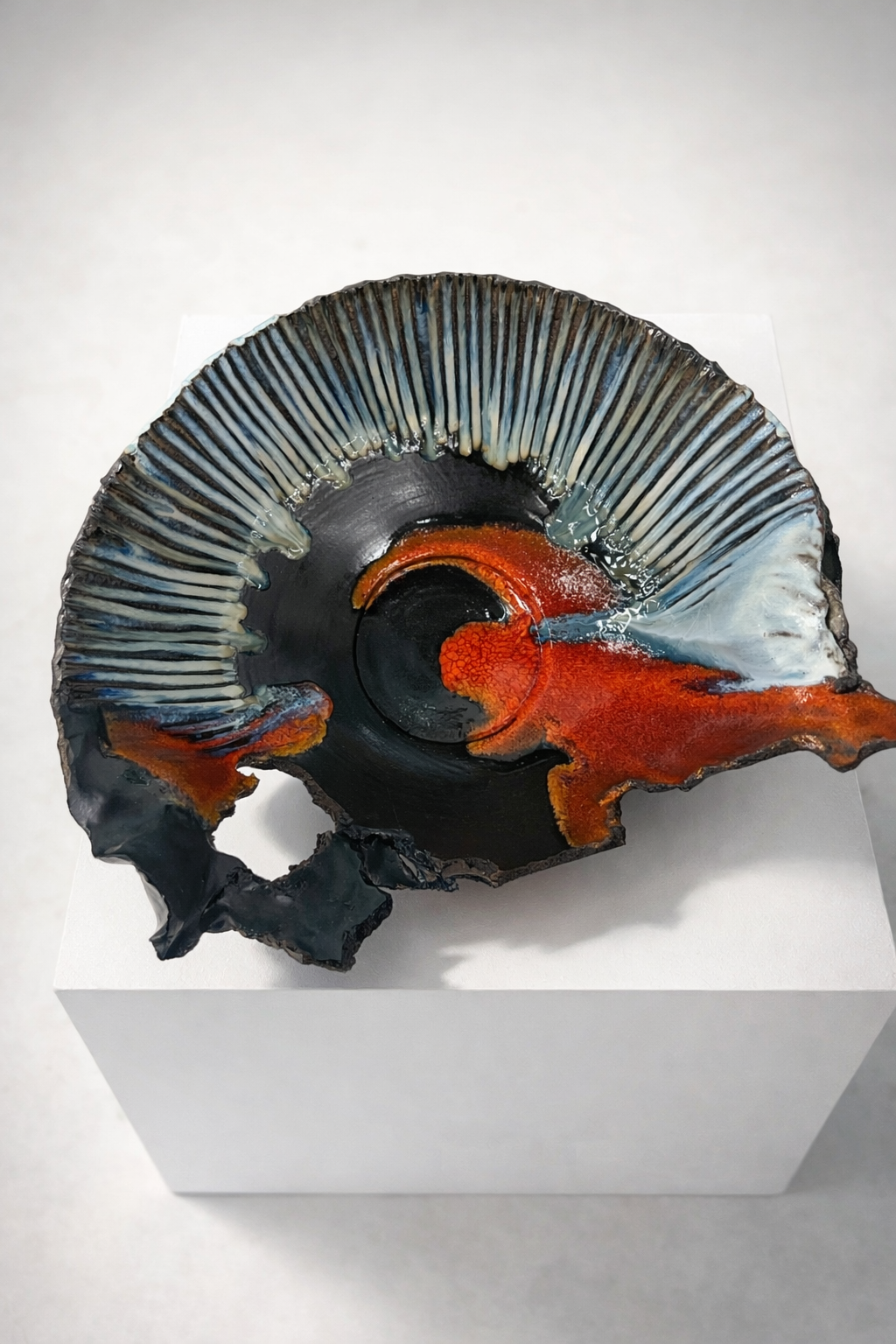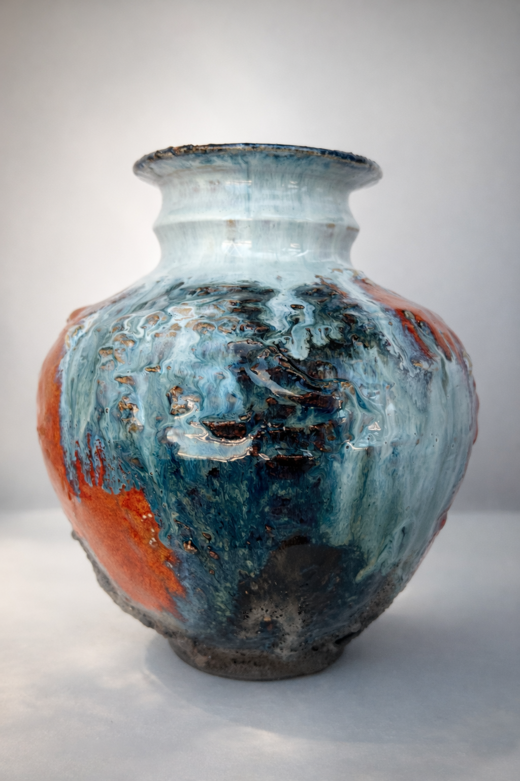 Процесс начинается с «идеальной» формы на круге, которую я намеренно нарушаю. Встраиваю в тело сосуда новые, диссонирующие элементы и перегружаю глазурь, позволяя материалу вступить в игру со случайностью, обнажить скрытые слои и текстуры.