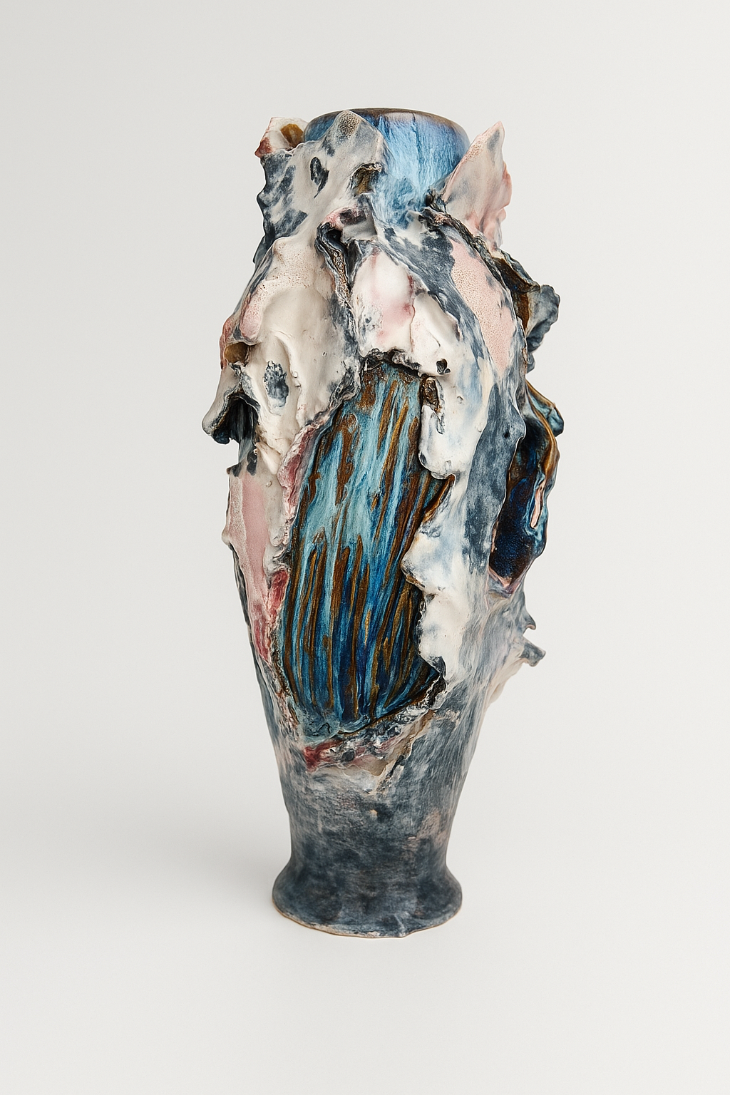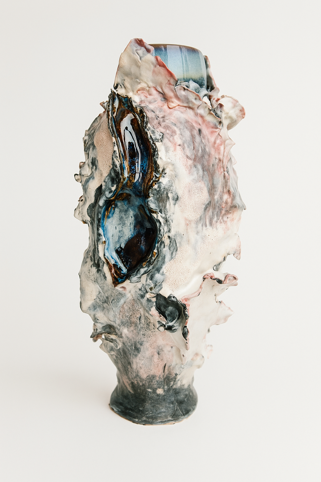 Мой процесс начинается с условно «совершенной» формы на гончарном круге. Затем я вмешиваюсь: встраиваю и создаю новые элементы. Глазури я намеренно перегружаю, позволяя случайности выявить скрытое.